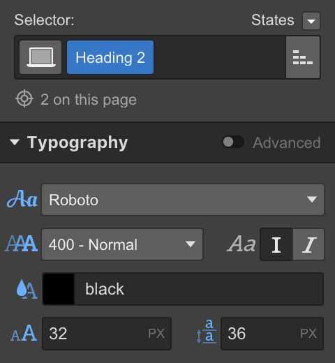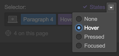 On the top right of the selector section, there is a states dropdown. Here you can edit element styles at different states. The most common use for this is adding hover effects to elements such as buttons.
